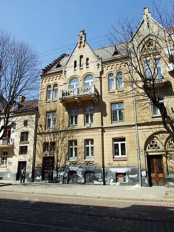Житловий будинок (№ 22) Розмір зображення: 600:800 піксел 19 квітня 2013 р. Фото М.І.Жарких. Вкладені елементи 2013 р. Романські вікна 3-го поверху