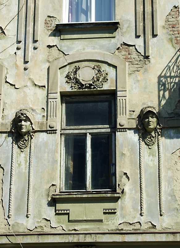 Сецесійне вікно 2-го поверху Розмір зображення: 583:800 піксел 19 квітня 2013 р. Фото М.І.Жарких. Вкладені елементи Сецесійний маскарон