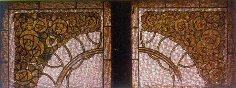 Примітка. Стилізовані троянди є елементом композиції не тільки вітражних полотен, а й керамічної плитки, якою викладені сходові площадки кам’яниці. На останньому поверсі характер композиційного рисунка вітражних сегментів зберігається, тільки замість троянд зображені стилізовані кульбаби. Барви і частково рисунок втрачені.