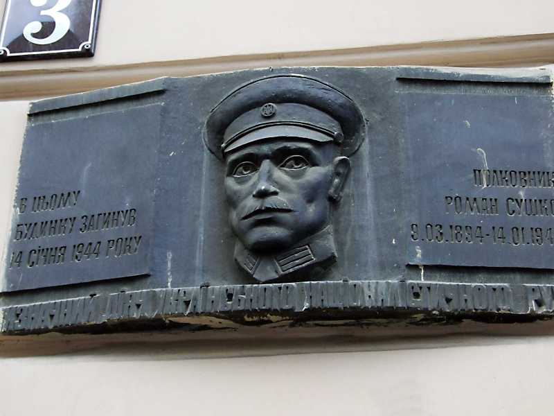 На дошці напис: «У цьому будинку 14 січня 1944 року загинув полковник Роман Сушко (90.3.1894 – 14.01.1944), визначний діяч українського націоналістичного руху».