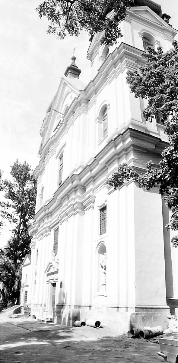 1990 р. Головний фасад. Вигляд з південного заходуРозмір зображення: 590:1200 піксел 1990 р. 2 червня. Фото М.І.Жарких. Негатека, № 613-08+9. |