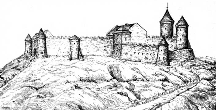 Гіпотетичний вид в сер. 16 ст.Розмір зображення: 705:361 піксел Вигляд з південного заходу [Czołowski A. Wysoki zamek. – Lw.: 1910, s. 55.] |