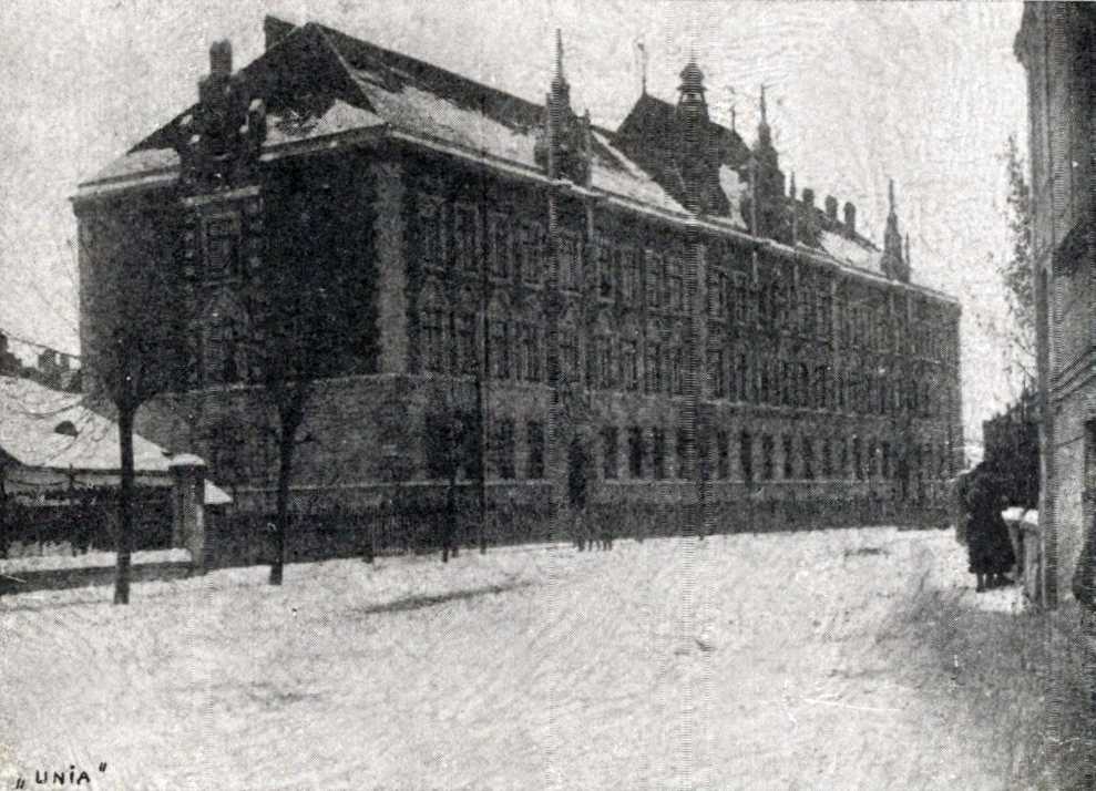 1918 р. Загальний виглядРозмір зображення: 989:714 піксел Поштівка: будинок школи ім. Сенкевича у Львові. Gmach szkoły Sienkiewicza. – [Lwów] : nakładem Kramu Studenckiego Komitetu Akcyi, [1918] ([Lwów] : «Unia») (pocztówka); 9,2 × 14 cm |