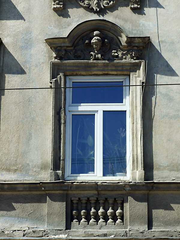 Вікно 2-го поверху Розмір зображення: 600:800 піксел 18 квітня 2013 р. Фото М.І.Жарких. Вкладені елементи Рельєфний фронтон з маскароном