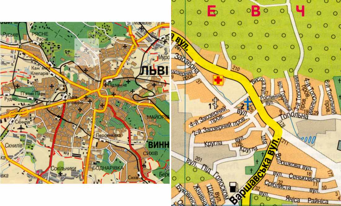 Ситуаційний план (монастир позначено синім хрестом – 2)Розмір зображення: 1100:666 піксел Джерело: Карта м.Львова. – К.: 2001 р., 1:20 000. |