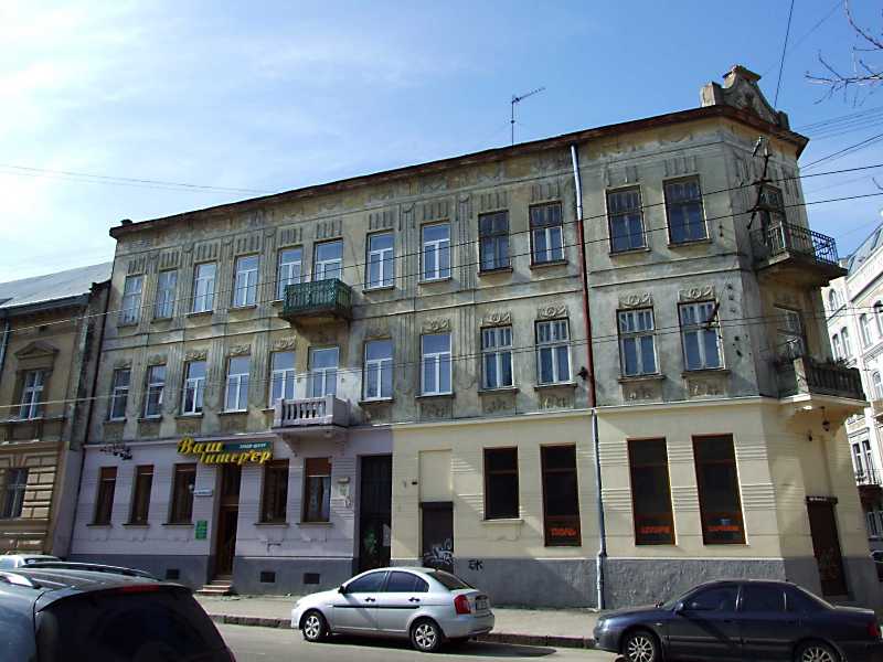 2013 р. Фасад по вул. Зеленій Розмір зображення: 800:600 піксел 16 квітня 2013 р. Фото М.І.Жарких. Вкладені елементи Вікна 2-го поверху з рельєфами