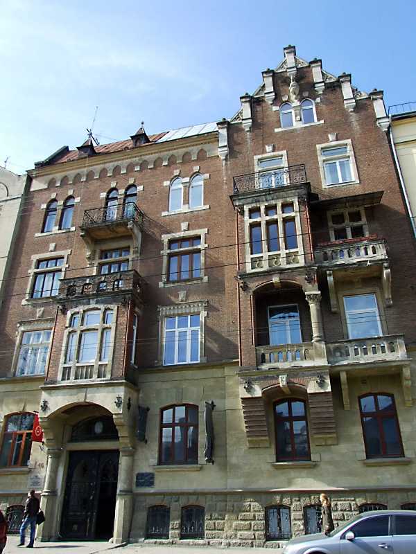2013 р. Головний фасад Розмір зображення: 600:800 піксел 16 квітня 2013 р. Фото М.І.Жарких. Вкладені елементи Фронтон (+) Колонка лоджії 2-го поверху Портал