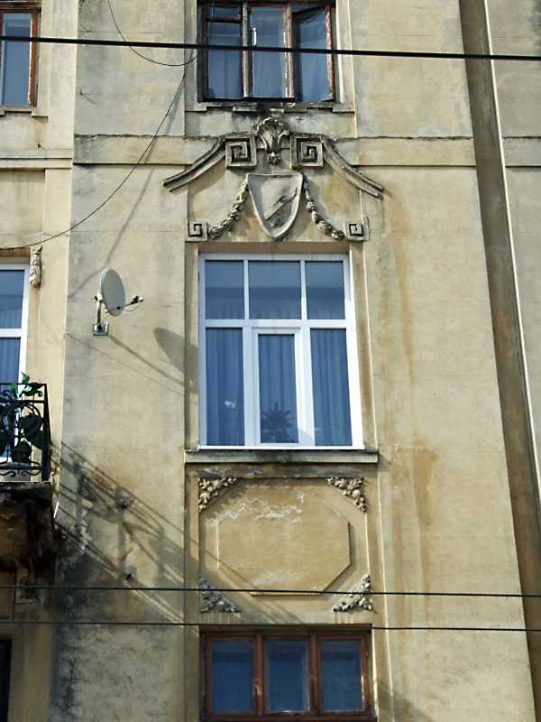 Сецесійне вікно 3-го поверху Розмір зображення: 600:800 піксел 16 квітня 2013 р. Фото М.І.Жарких. Вкладені елементи Сецесйний фронтон над вікном