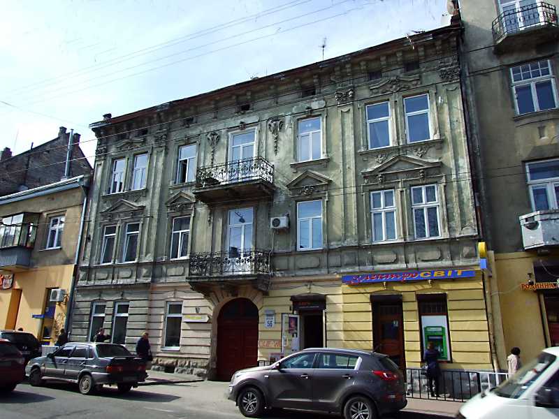 Житловий будинок (№ 56) Розмір зображення: 800:600 піксел 16 квітня 2013 р. Фото М.І.Жарких. Вкладені елементи 2013 р. Вікна 3-го поверху 2013 р. Вікна 2-го поверху 2013 р. Загальний вигляд