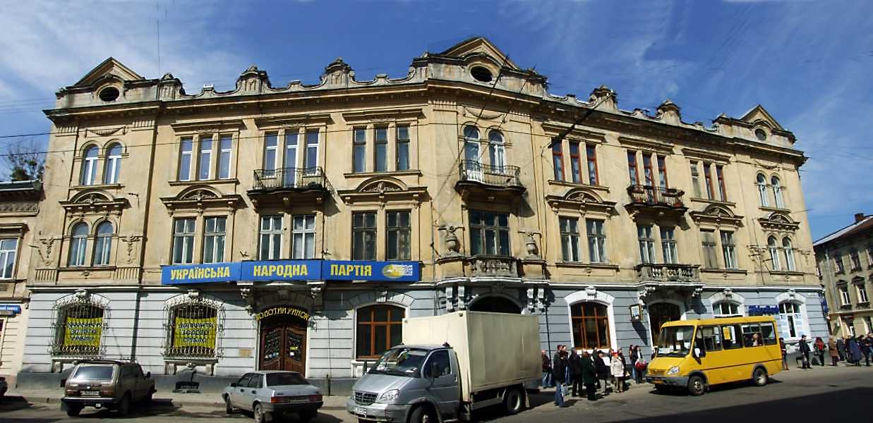 2013 р. Фасад по вул. Шота Руставелі Розмір зображення: 1237:600 піксел 16 квітня 2013 р. Фото М.І.Жарких. Вкладені елементи Ліва частина Права частина Вікна 2-го поверху (+) Вікна 2-го поверху (2) (+)
