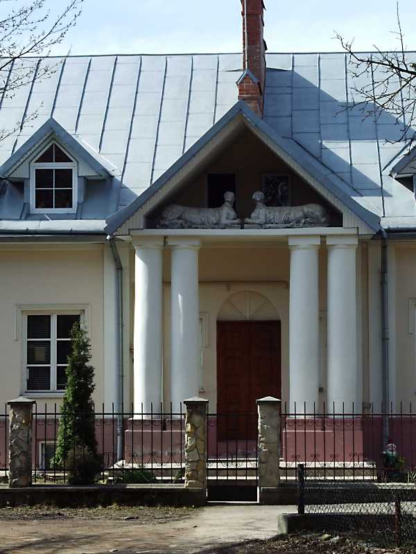 2013 р. Центральна частина головного фасаду Розмір зображення: 600:800 піксел 16 квітня 2013 р. Фото М.І.Жарких. Вкладені елементи Скульптури сфінксів у тимпані