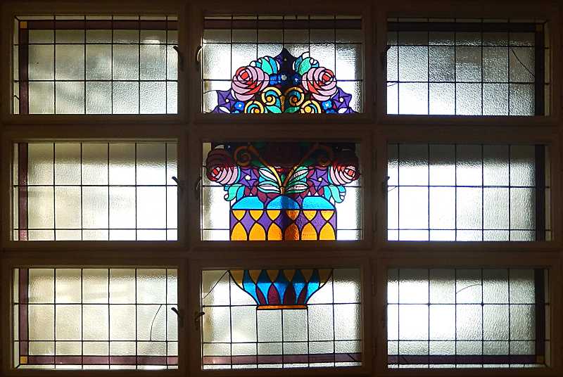 Центральна секція вітража сходової клітки Розмір зображення: 800:536 піксел Фото Ольги Соляр, 25 жовтня 2017 р. Попередня сторінка | Вище | Наступна сторінка