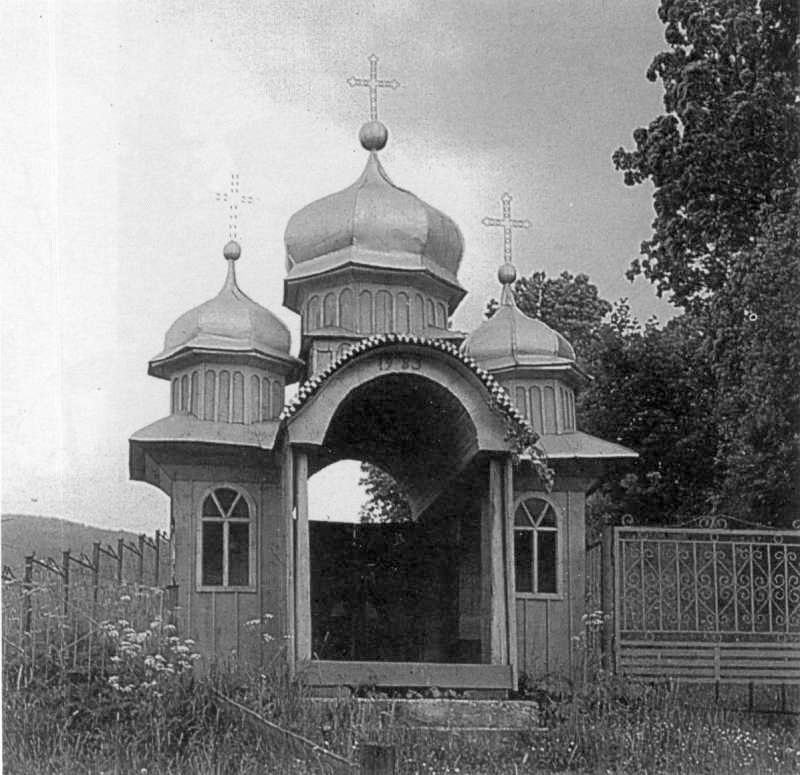 1992 р. Загальний вигляд каплиціРозмір зображення: 800:775 піксел Каплиця коло церкви. Світлина І. Синкальського 1992 р. Джерело: Слободян В. Церкви України: Перемиська єпархія. – Льв.: 1998 р., с. 115. |