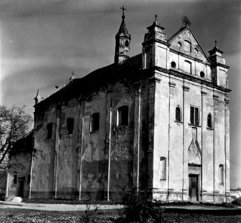 Костел діви Марії Розмір зображення: 800:739 піксел На фронтоні дат – 1728 р. Вкладені елементи 1988 р. Загальний вигляд з позиції А4 1988 р. Фрагмент головного фасаду (+) 1988 р. Гробівець 1988 р. Гробівець 2019 р. Загальний вигляд з позиції А1