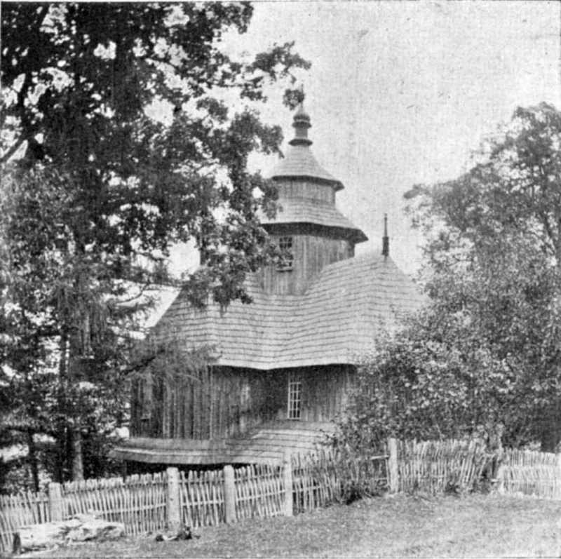 [1937 р.] Загальний виглядРозмір зображення: 800:797 піксел Церква 18 ст. (дерев.). Джерело: Драган М. Українські деревляні церкви. – Льв: 1937 р., т. 2, с. 123. |