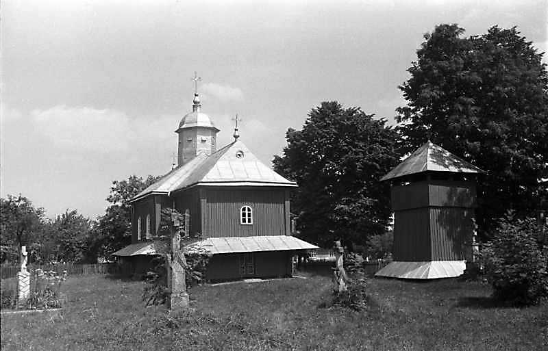 1989 р. Церква і дзвіниця. Вигляд з північного заходуРозмір зображення: 800:513 піксел 1989 р. 7 липня. Фото М.І.Жарких. Негатека, № 528-09. |
