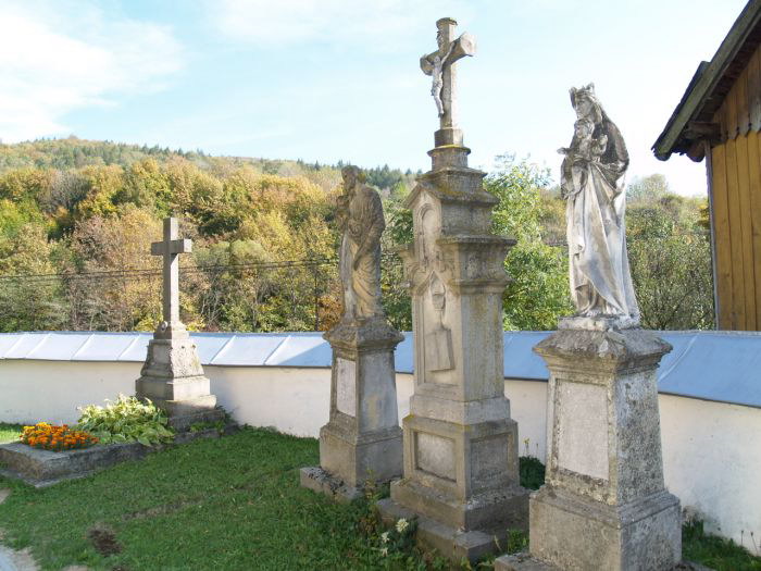Фігури і хрести на обійсті Розмір зображення: 700:525 піксел Джерело: пояснює, що це надгробки роду Менцинських. Попередня сторінка | Вище | Наступна сторінка