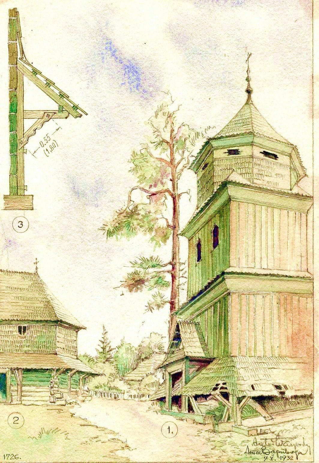 Церква Розмір зображення: 1063:1542 піксел Вкладені елементи 1932 р. Загальний вигляд дзвіниці 1932 р. Дзвіниця. План, переріз, деталі