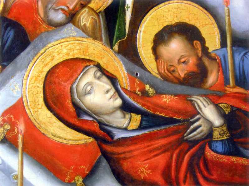 Марія на одрі (півпостать) Розмір зображення: 800:600 піксел Вкладені елементи Голова Марії Руки Марії Голова апостола