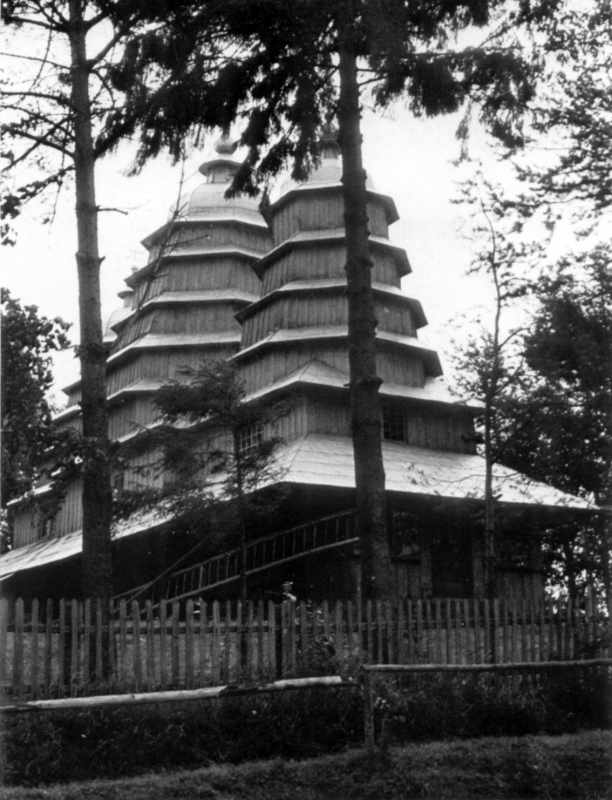 [1987 р.] Загальний вигляд з південного сходуРозмір зображення: 612:800 піксел Джерело: Titus D. Hewryk Masterpieces in wood: houses of worship in Ukraine. – New York, 1987, № 121. |