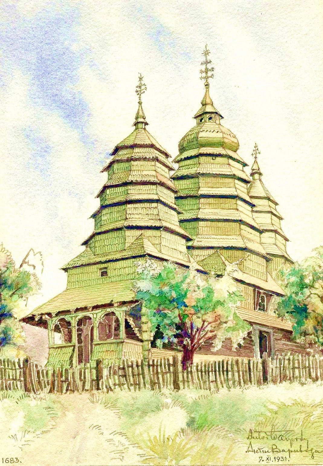 1931 р. Загальний вигляд з південного заходуРозмір зображення: 1069:1542 піксел Рисунок Антона Вариводи (Краків), 7.11.1931 р. 1683 Church, Matkova (Matkowa), Drohobych, Ukraine. Southwestern view. |