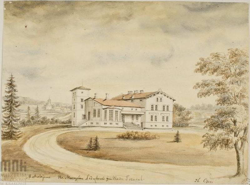 Pałac Ledóchowskich. Widok od strony podjazdu. Pałac o zróżnicowanej bryle, z czworoboczną wi… wielobocznym ryzalitem i zewnętrznymi schodami. 1862—1876. Dat.: 26 Czer. Na… Matwiejowce Hr. Mieczysław Leduchowski żona Wanda Trzeciak; napis na podkład… Wołyń Matwiejowce, — dwór. Rys. ołówkiem podmalowany akwarelą, 20,5x27,7. III-r.a. 4198 (Teka Wołyń) [Katalog rysunków architektonicznych ze zbiorów Muzeum narodowego w Krakowie. 1. Rysunki Napoleona Ordy / Opracowały Zofia Kucielska i Zofia Tobiaszowa. – Warszawa: Państwowe wydawnictwo naukowe, 1975, Nr. 417]