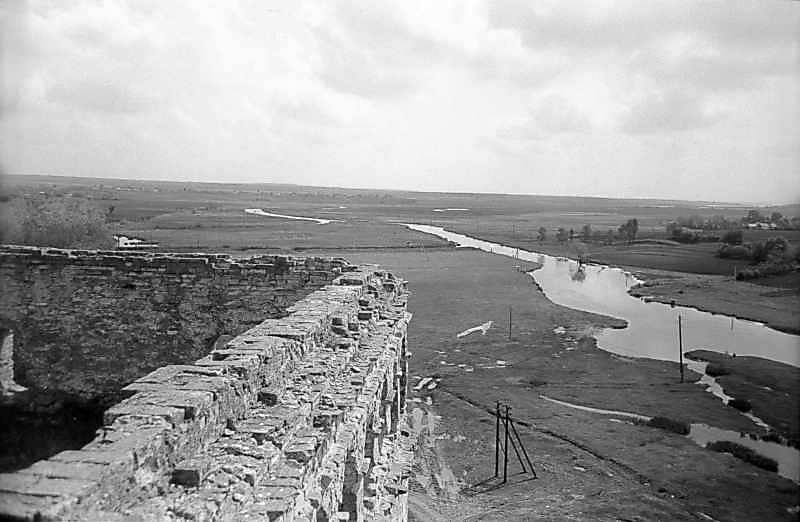 1978 р. Верхній ярус башти на тлі долини. Вигляд із заходуРозмір зображення: 800:522 піксел 1978 р. 29 травня. Фото М.І.Жарких. Негатека, № 058-36. |