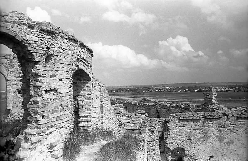 1978 р. Верхні яруси круглої і квадратної башт. Вигляд із заходуРозмір зображення: 800:520 піксел 1978 р. 29 травня. Фото М.І.Жарких. Негатека, № 059-03. |
