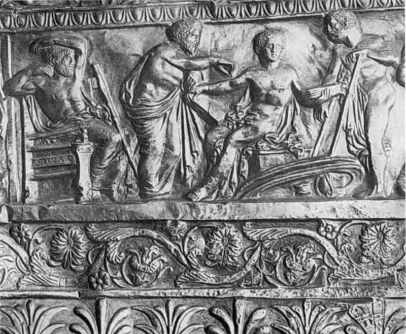 Фрагмент обкладки горита з рельєфним зображенням сцен з життя Ахілла з Мелітопольського кургану Запорізької обл. IV ст. до н. е. Золото. Розміри 48: 27 см. Київський музей історичних коштовностей.