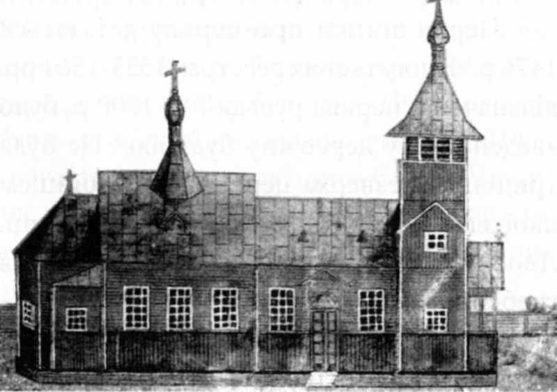 Перша дерев’яна церква, згідно зі збереженим рисунком, була будівлею в неоросійському стилі. Складалася з широкої квадратової нави посередині, до якої зі сходу прилягав вужчий гранчастий вівтар з двома захристіями по боках, а з заходу – прямокутний дещо вужчий бабинець, до якого з заходу примикав вужчий присінок з двома прямокутними приміщеннями по боках (в північному розташовувались сходи на хори, а в південному – невеликий склад). Наву і бабинець вкривали двосхилі дахи, вівтар – п’ятисхилий. Гребінь даху нави вінчала восьмибічна вежечка, вкрита наметом з маківкою. Над присінком здіймався ярус чотирибічної вежі-дзвіниці, завершений пірамідальним наметом з маківкою. Стіни церкви були шальовані горизонтально дошками.