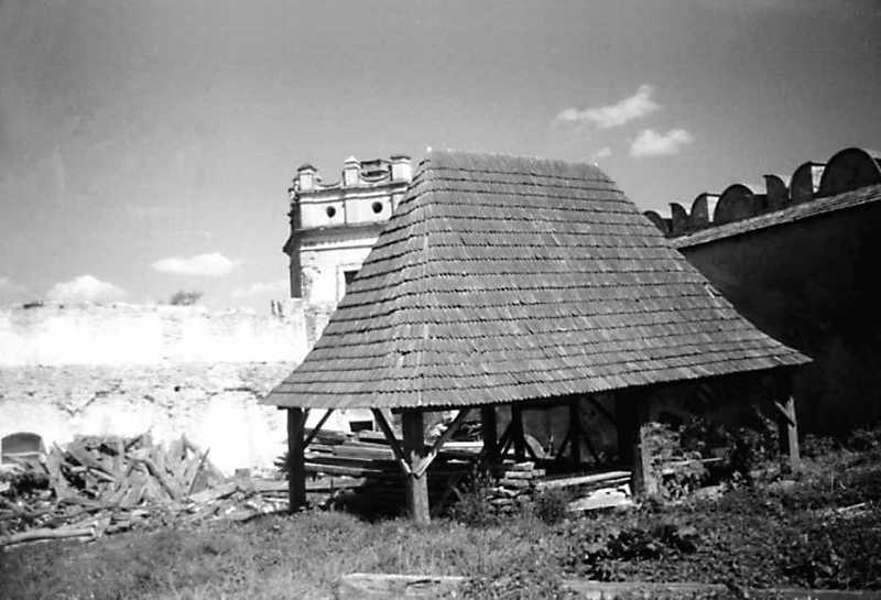 1991 р. Дерев’яний навіс (над криницею?) на тлі північно-східної баштиРозмір зображення: 800:545 піксел 1991 р. 24 серпня. Фото М.І.Жарких. Негатека, № 748-28. |