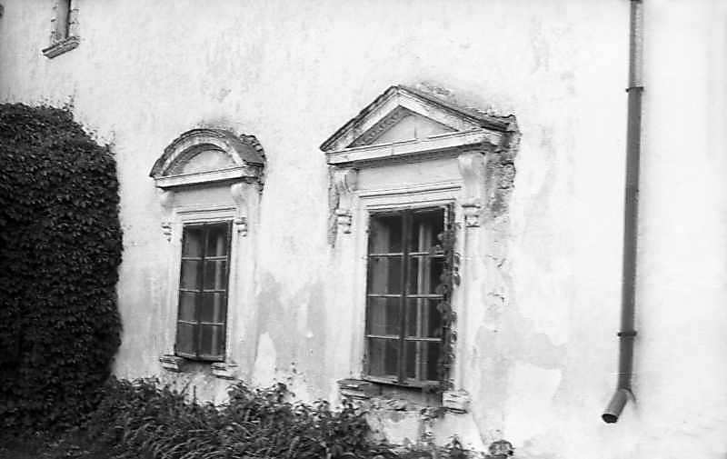 1976 р. Вікна 1-го поверху на західному фасаді. Вигляд з південного заходуРозмір зображення: 800:505 піксел 1976 р. 10 червня. Фото М.І.Жарких. Негатека, № A134-33. |