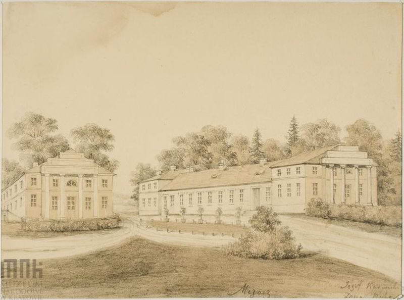 Pałac Karwickich. Widok dwóch równoległych skrzydeł pałacu. Budynki parterowe z piętrowymi i łonami po bokach, z portykami kolumnowymi zwieńczonymi schodkowymi przyczół… w elewacjach bocznych. 1862 – 1876. Napis: Mizocz-r Józef Karwicki żona… ; napis na podkładzie: Gub. Wołyńska — Mizocz,—pałac. Rys. ołówkiem podmalowany sepią, 18,4x24,6. Ill-r.a. 4205 (Teka Wołyń). [Katalog rysunków architektonicznych ze zbiorów Muzeum narodowego w Krakowie. 1. Rysunki Napoleona Ordy / Opracowały Zofia Kucielska i Zofia Tobiaszowa. – Warszawa: Państwowe wydawnictwo naukowe, 1975, Nr. 433]
