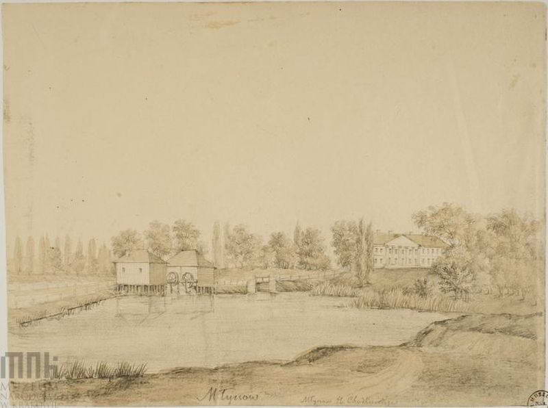 Pałac Chodkiewiczów. Widok ogólny od strony rzeki Ikwy. Z lewej strony na rzece dwa młyny. 1862 – 1876. Napis: Młynów. Młynów Hr. Chodkiewicza; napis na podkładzie: G. Wołyńska Młynów, – pałac i młyny. Rys. ołówkiem podmalowany sepią, 18,4x24,4. Ill-r.a. 4208 (Teka Wołyń) [Katalog rysunków architektonicznych ze zbiorów Muzeum narodowego w Krakowie. 1. Rysunki Napoleona Ordy / Opracowały Zofia Kucielska i Zofia Tobiaszowa. – Warszawa: Państwowe wydawnictwo naukowe, 1975, Nr. 437]