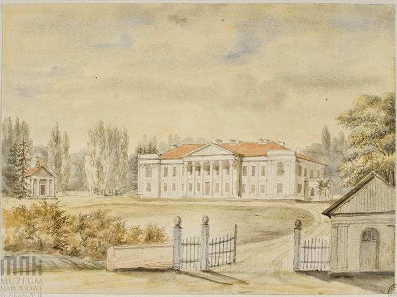 Pałac Zamojskich dawniej Giżyckich. Widok od strony podjazdu. Pałac dwukondygnacjowy z portykiem kolumnowym w wielkim porządku i z pozornymi ryzalitami bocznymi; z lewej strony kaplicz pałacowa z portykiem kolumnowym; na pierwszym planie przy bramie wjazdowej parterowa stróżówka (?). Napis na podkładzie: Mołoczki, – pałac. Wołyń. 1862 – 1876. Rys. ołówkiem podmalowany akwarelą. 20,5 x 27,8 cm. Muzem Narodowe, Kraków. III-r.a. 44212 (Teka Wołyń). [Katalog rysunków architektonicznych ze zbiorów Muzeum narodowego w Krakowie. 1. Rysunki Napoleona Ordy / Opracowały Zofia Kucielska i Zofia Tobiaszowa. – Warszawa: Państwowe wydawnictwo naukowe, 1975, Nr. ]