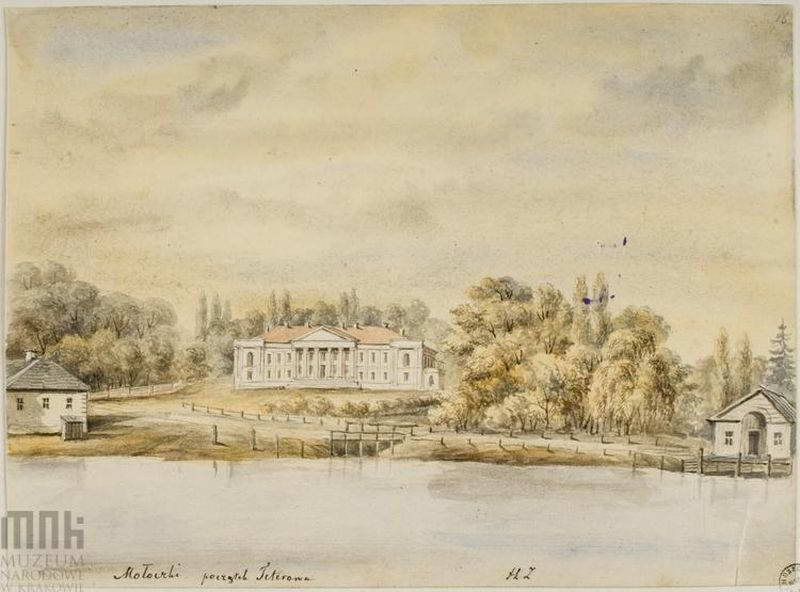 Widok elewacji ogrodowej od strony rzeki Teterów. 1862—1876. Napis: Mołoczki; początek Teterowa. Hr. Z.; napis na podkładzie: Moloczki, pałac. Wołyń. Rys. ołówkiem podmalowany akwarelą, 20,5x27,9. III-r.a. 4211 (Teka Wołyń) [Katalog rysunków architektonicznych ze zbiorów Muzeum narodowego w Krakowie. 1. Rysunki Napoleona Ordy / Opracowały Zofia Kucielska i Zofia Tobiaszowa. – Warszawa: Państwowe wydawnictwo naukowe, 1975, Nr. 443]