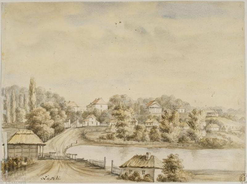 Widok ogólny od strony rzeki z zespołem pałacowym w głębi. Pałac dwukondygnacjowy; z prawej strony w ogrodzie budowla z portykiem kolumnowym. 1862 – 1876. Napis: Łaszki; napis na podkładzie: Wołyń Łaszki. Rys. ołówkiem podmalowany akwarelą, 20,5 x 27,8. III-r.a. 4189 (Teka Wołyń) [Katalog rysunków architektonicznych ze zbiorów Muzeum narodowego w Krakowie. 1. Rysunki Napoleona Ordy / Opracowały Zofia Kucielska i Zofia Tobiaszowa. – Warszawa: Państwowe wydawnictwo naukowe, 1975, Nr. 395]