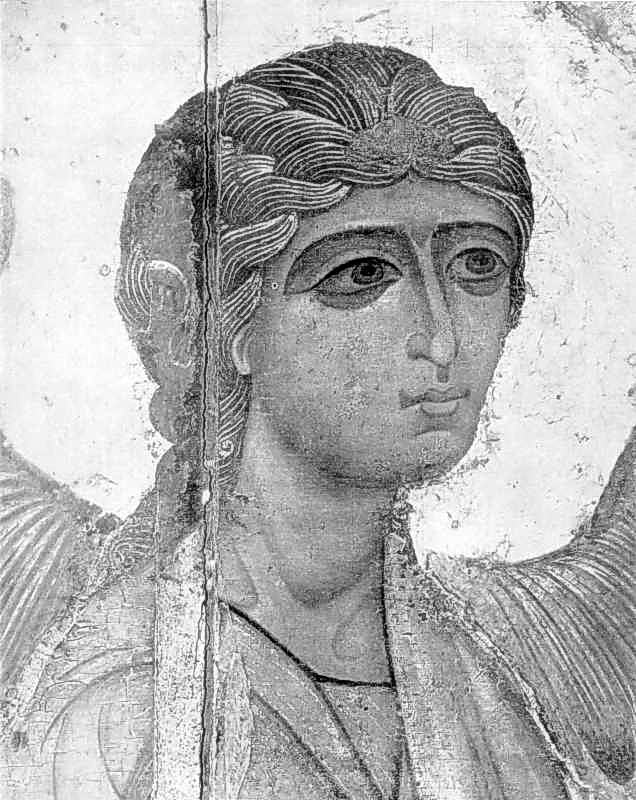 Голова архангела Гавриїла. Деталь ікони «Устюзьке благовіщення» з Юр’єва монастиря (м. Новгород). XII ст. Державна Третьяковська галерея (Москва).