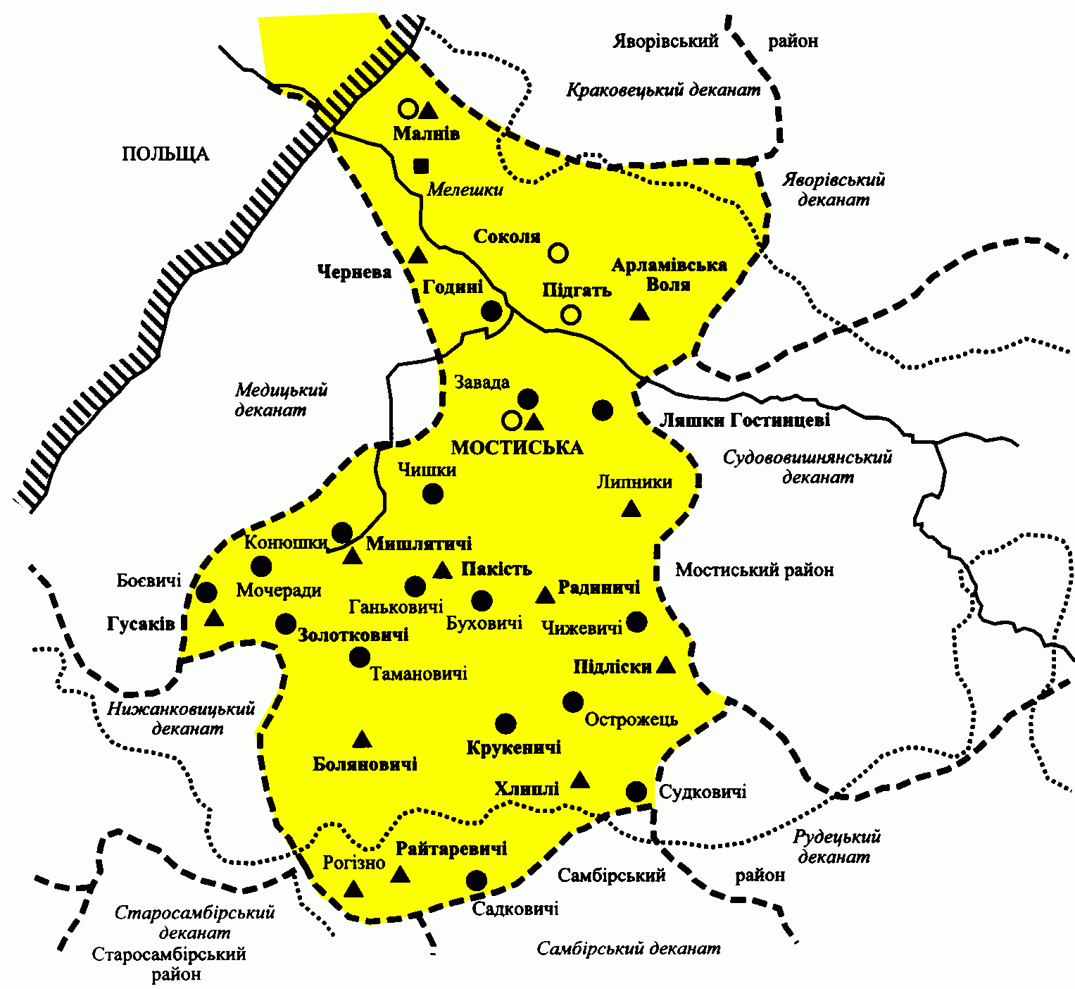 Картосхема деканату за В.СлободяномРозмір зображення: 1527:1404 піксел Джерело: Слободян В. Церкви України: Перемиська єпархія. – Льв.: 1998 р., с. 359. |