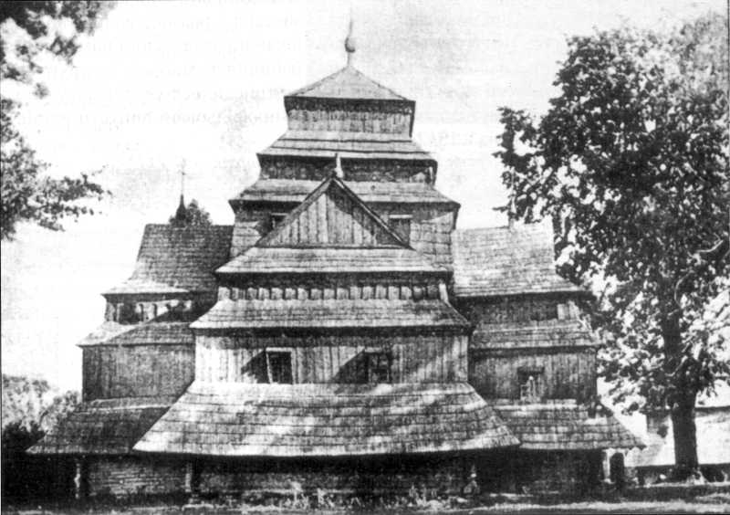 Дерев’яна церква, зведена в 1762 році. Належала до надзвичайно рідкісного типу хрещатих у плані бойківських церков. Складалася з квадратової нави, прямокутних, рівношироких наві бічних рамен і трохи довших вівтаря та бабинця. Над вищим за інші зрубом нави здіймався пірамідальний чотирибічний верх з двома заломами, увінчаний маківкою. Рамена хреста покривали на невеликому заломі двосхилі причілкові дахи з острішками, завершені на гребенях маківками. Оперізувало споруду потужне піддашшя, оперте на випусти вінців зрубів. Мальовничості церкві додавало ґонтове покриття дахів і кожухування стін. Згоріла під час Першої світової війни.