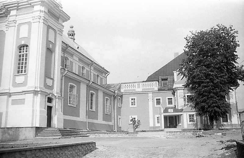 1996 р. Бічний фасад костелу та келії. Вигляд із заходуРозмір зображення: 800:518 піксел 1996 р. 9 липня. Фото М.І.Жарких. Негатека, № 889-27. |