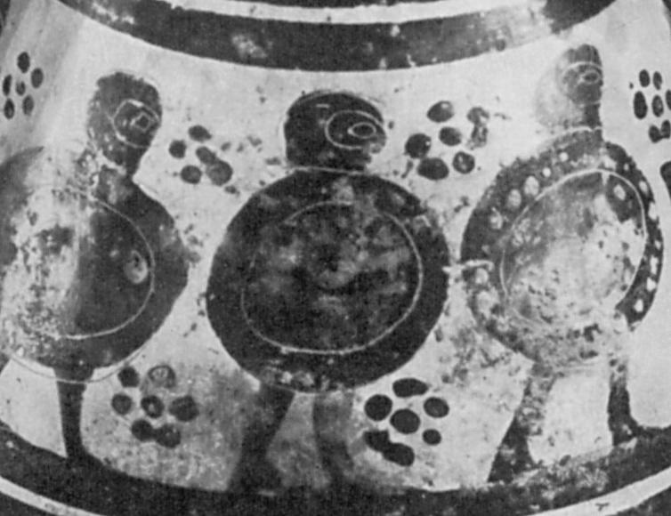 Воїни зі щитамиРозмір зображення: 754:580 піксел Джерело: Одесский археологический музей АН УССР. – К.: Наукова думка, 1983 г., № 44. |