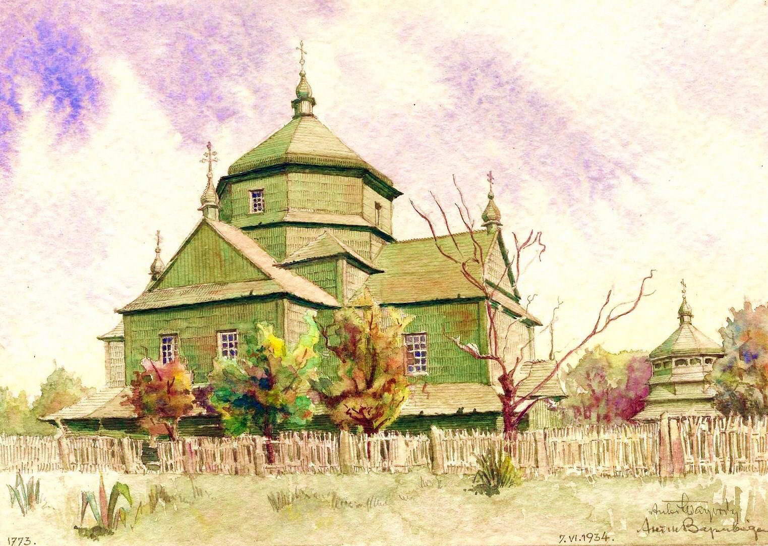 1934 р. Загальний вигляд з позиції А4Розмір зображення: 1523:1082 піксел Рисунок Антона Вариводи (Краків), 7.06.1934 р. 1773 Church, Mykulychyn (Mikuliczyn), Nadvirna, Ukraine. Northwestern view. |