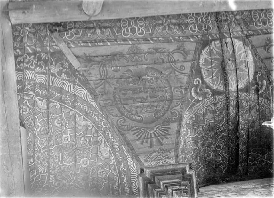 Фрагмент стінопису (парус із написом; склепіння)Розмір зображення: 960:693 піксел Фото Стефана Таранушенка і Павла Жолтовського з експедиції Харківського музею українського мистецтва. 1920-і рр. (?) Опубліковано 5.11.2019 р. |