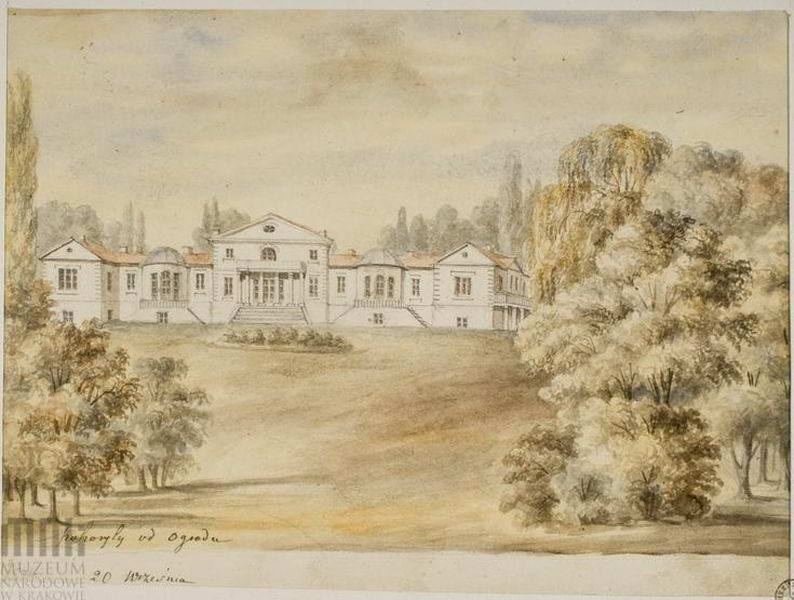 Pałac Czetwertyńskich. Widok od strony ogrodu. Pałac z tarasem wspartym na kolumnach i schodami zewnętrznymi w ryzalicie środkowym oraz dwoma półkolistymi ryzalitami po bokach. 1874. Dat.: 1874 20 Września. Napis: Pohoryly od ogrodu; napis na podkładzie: G. Wołyńska. Pohoryly, – pałac. Rys. ołówkiem podmalowany akwarelą, 20,5 x 27,7. III-r.a. 4233 (Teka Wołyń). [Katalog rysunków architektonicznych ze zbiorów Muzeum narodowego w Krakowie. 1. Rysunki Napoleona Ordy / Opracowały Zofia Kucielska i Zofia Tobiaszowa. – Warszawa: Państwowe wydawnictwo naukowe, 1975, Nr. 554]