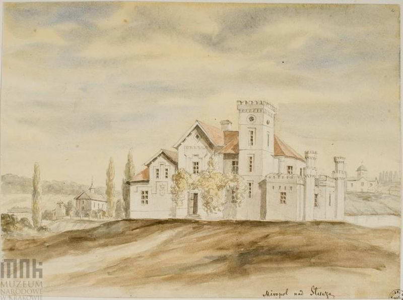 Pałac Czapskich. Widok fasady. Pałac dwukondygnacjowy o zróżnicowanej bryle, z czworot… wieżą i parterową częścią zwieńczonymi krenelaźem; z lewej strony w głębi kościół z… turką; z prawej kościół z kopułą. 1862 – 1876. Napis: Miropol nad Sluczr napis na… dzie: Wołyń Miropol — dwór, Rys. ołówkiem podmalowany akwarelą, 20,5x27,9. Ill-r.a. 4204 (Teka Wołyń). [Katalog rysunków architektonicznych ze zbiorów Muzeum narodowego w Krakowie. 1. Rysunki Napoleona Ordy / Opracowały Zofia Kucielska i Zofia Tobiaszowa. – Warszawa: Państwowe wydawnictwo naukowe, 1975, Nr. 431]