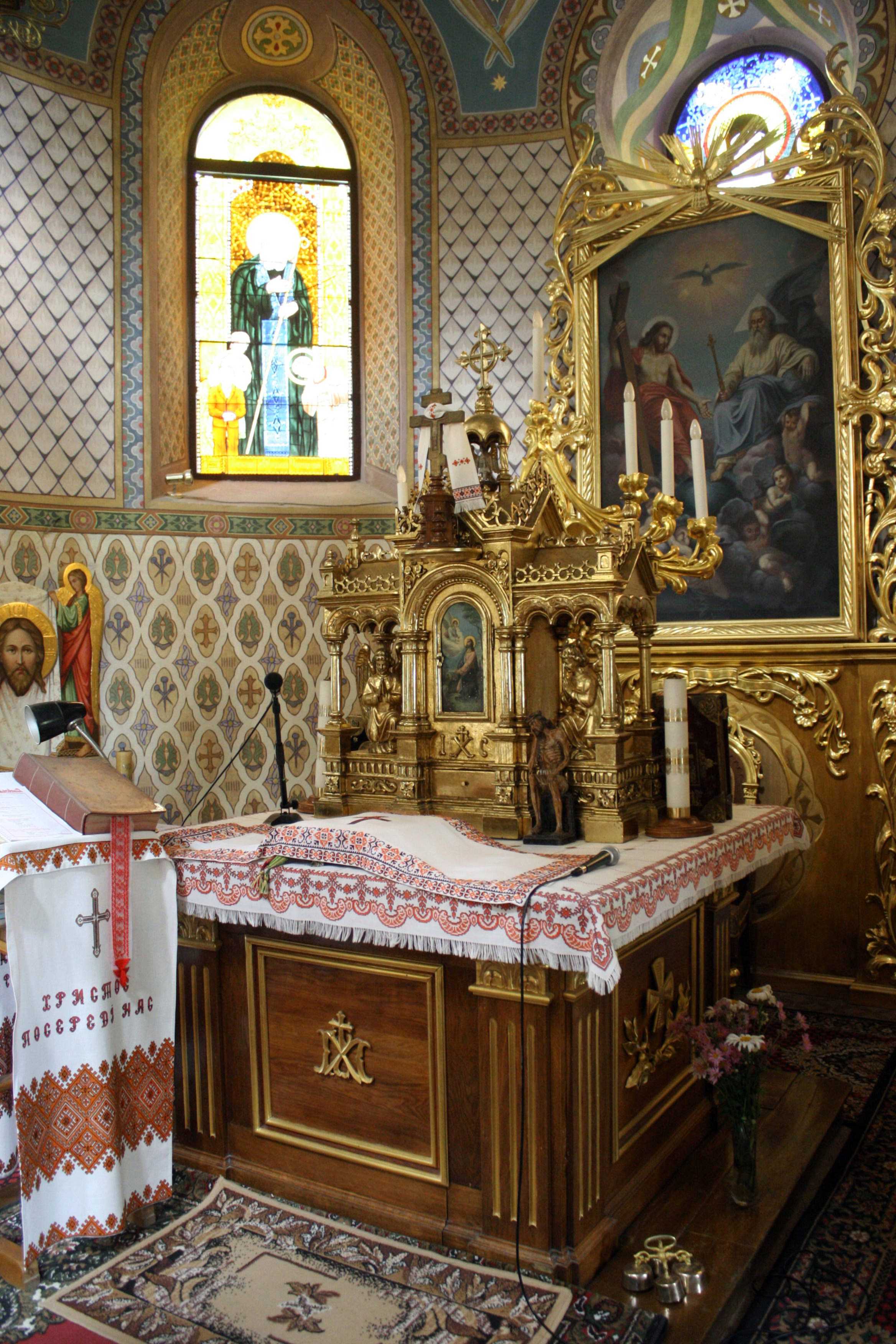 Інтер’єр вівтаря Розмір зображення: 2336:3504 піксел Фото Зенона Боровця і Богдана Тхора, 9 липня 2014 р. Вкладені елементи Ікона на склі «Митрополит Андрей Шептицький» Ікона на склі «Бл. св. Николай Чарнецький» Дарохранильниця Зворотній бік іконостаса (+) Літургікон (+)