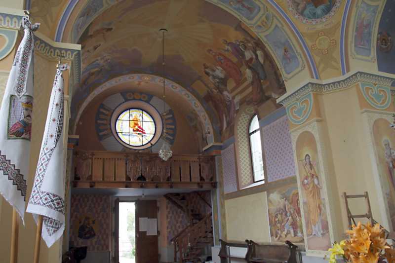 Інтер’єр бабинця Розмір зображення: 800:533 піксел Фото Зенона Боровця і Богдана Тхора, 9 липня 2014 р. Вкладені елементи Інтер’єр склепіння бабинця (+) Ікона на склі «Архангел Михаїл» Парапет хорів та склепіння (+)