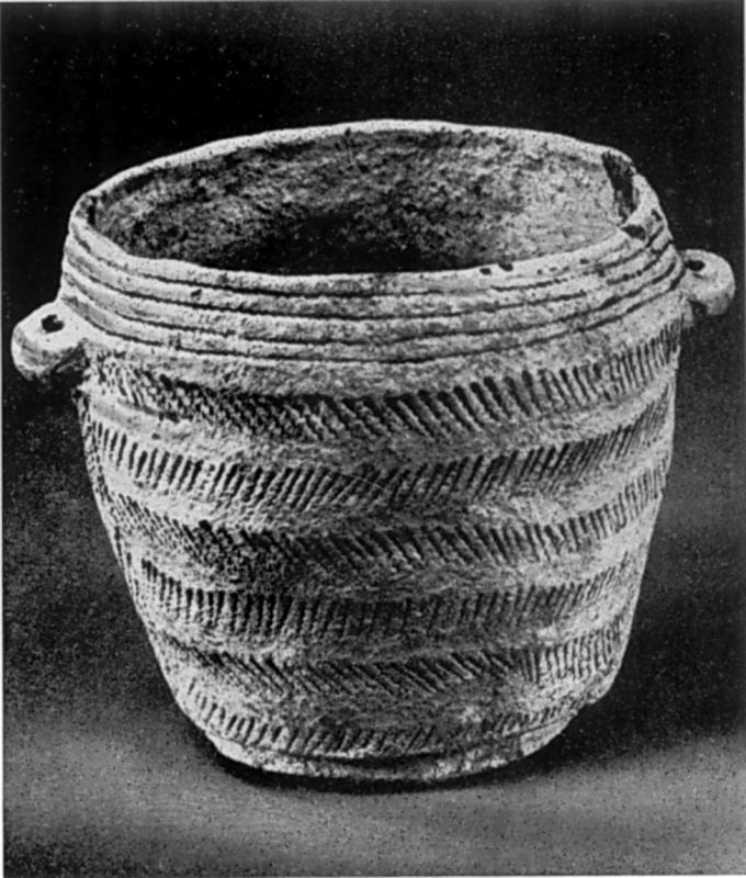 Кратеровидный кубок на поддоне, с ушками, имеющими вертикальные отверстия. Наружная поверхность орнаментирована отпечатками шнурового штампа.