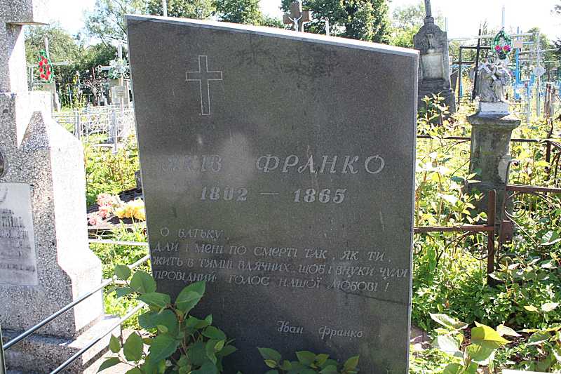 20717 р. Плита з написомРозмір зображення: 800:533 піксел Фото Зенона Боровця, 27 липня 2017 р. Напис: …О батьку! Дай і мені по смерті так, як ти, жить в тямці вдячних, щоб і внуки чули провідний голос нашої любви!» () |